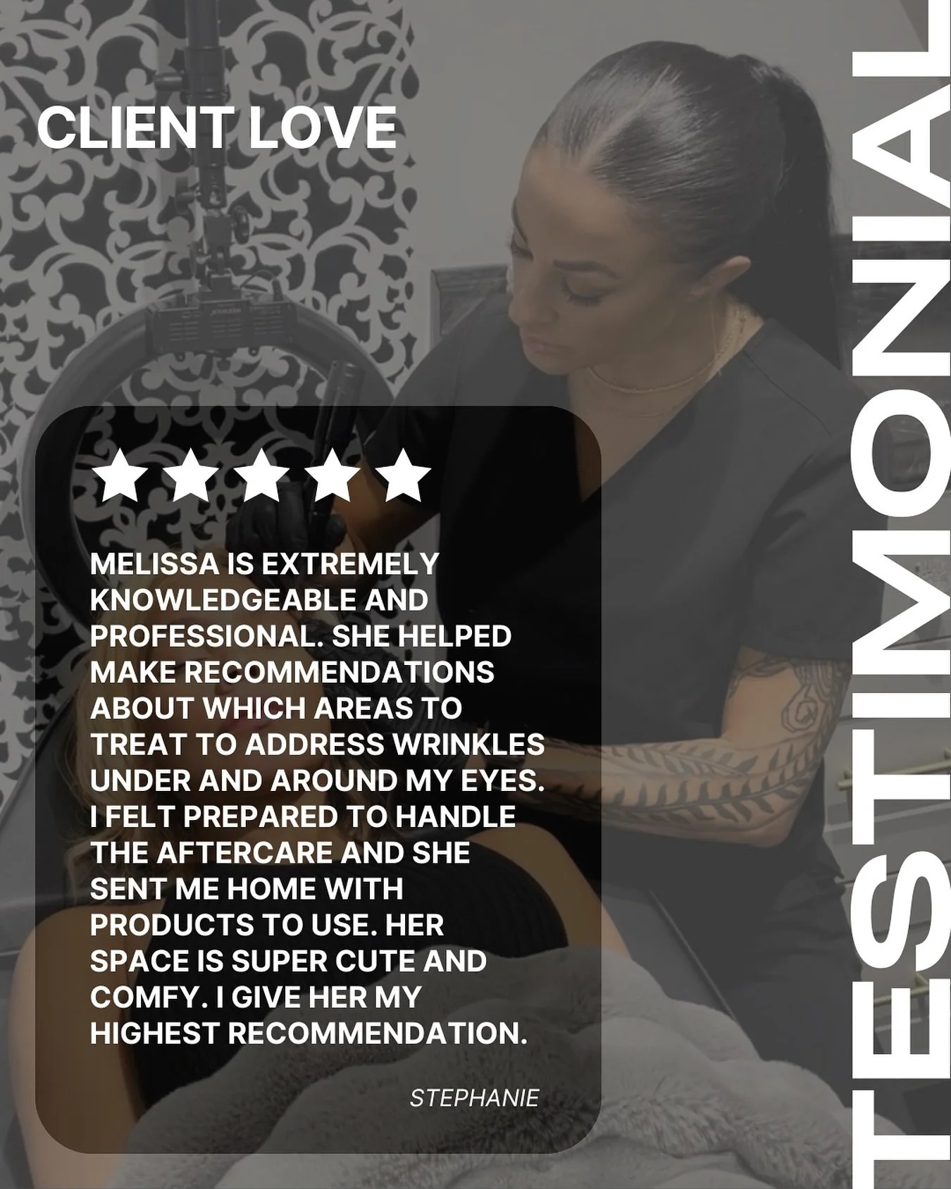 — N. Garetton“Melissa is so knowledgeable, kind and great at what she does. She makes sure you’re fully informed and fully prepares you for the after procedure care. I’m so glad I found this salon and highly recommend it..”